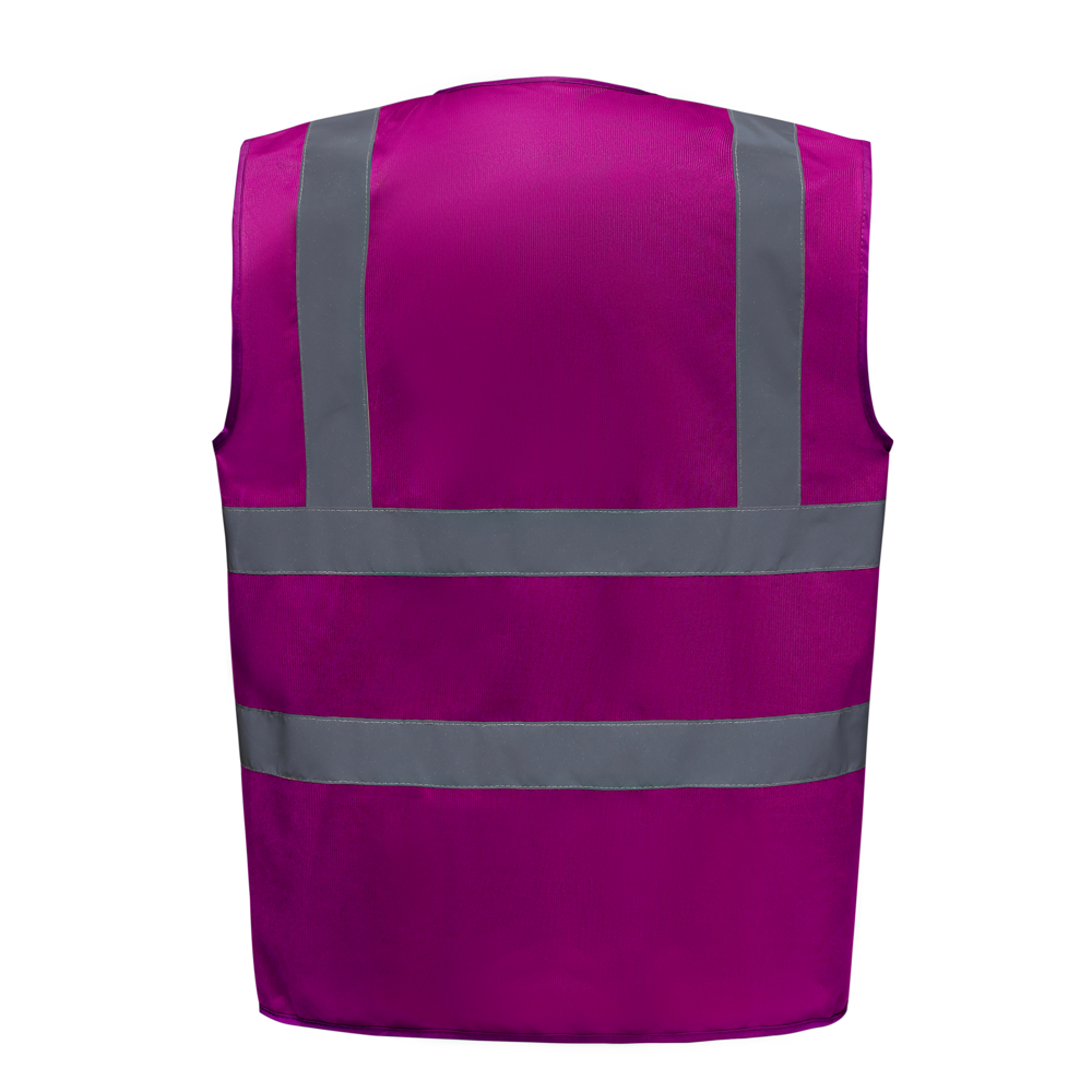 100% Polyester-Gewebe mit Klettverschluss. Zwei 5 cm breite Reflexstreifen um den Körper und einer über jeder Schulter. Hi-Vis Yellow, Hi Vis Orange, Orange/Hi Vis Yellow nach EN ISO20471: 2013 Klasse 2. Black/Hi Vis Yellow, Lime/Hi Vis Yellow, Navy/Hi Vis Yellow, Purple/Hi Vis Yellow, Paramedic Green/Hi Vis Yellow, Red/Hi Vis Yellow, Raspberry/Hi Vis Yellow, Royal Blue/Hi-Vis Yellow gemäß EN ISO20471: 2013 Klasse 1.