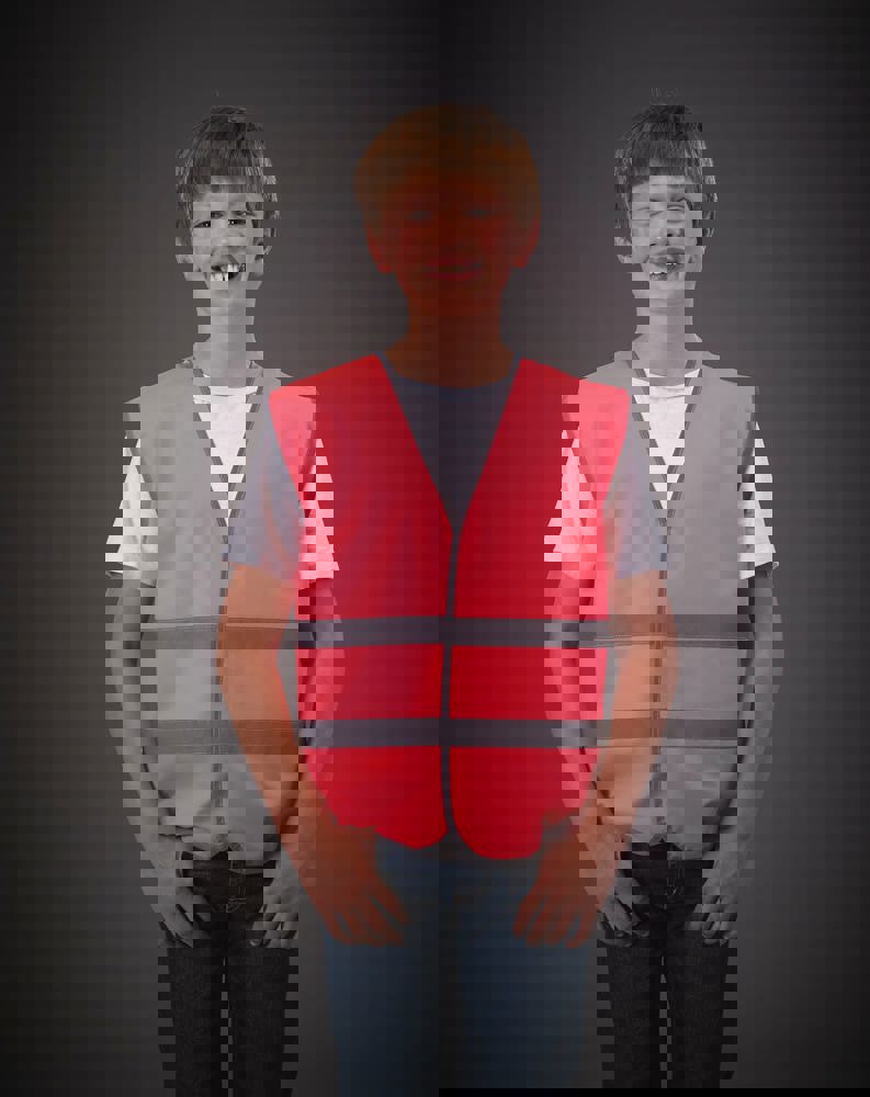 100% Polyester-Gewebe mit Klettverschluss; 2,5 cm breite Reflexstreifen um den Körper; Hi Vis Yellow & Hi Vis Orange nach EN1150:1999.