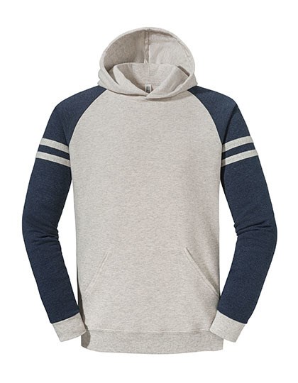 NuBlend® vorgeschrumpftes, pilling-resistentes 2-Enden-Fleece | Hergestellt aus nachhaltig erzeugter, in den USA angebauter Baumwolle | Hohe Maschendichte für eine glatte Druckfläche | Body in Oatmeal Heather für einen modernen, gleichzeitig zurückhaltenden Look | Kontrastfarbene Raglanärmel | Sportlich inspirierte College-Streifen an den Ärmeln | Kängurutasche vorne | Ärmelbündchen und Bund aus 1x1-Rippstrick (Ärmelbündchen passen zu den College-Streifen) | Vierteldrehung zur Vermeidung der Mittelfalte