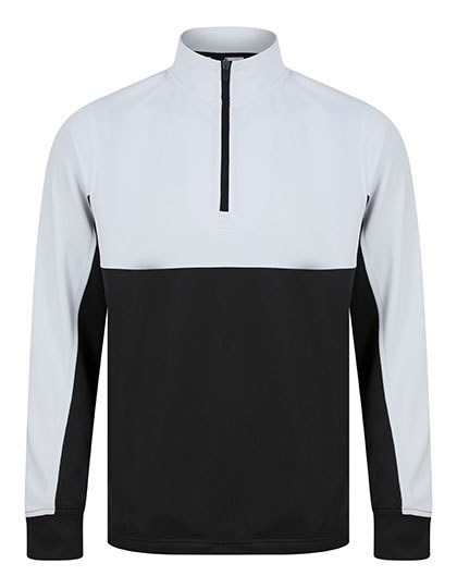 Kontrastierende Einsätze oben an der Brust und an den Ärmeln in Kontrastfarben | 1/4-Reißverschluss | Seitenblenden | Nylon-Reißverschlüsse auf der Rückseite an den mittleren Vorder- und Seitentaschen | 1x1-Ripp-Ärmelbündchen | Halbautomatischer Reißverschluss-Zipper