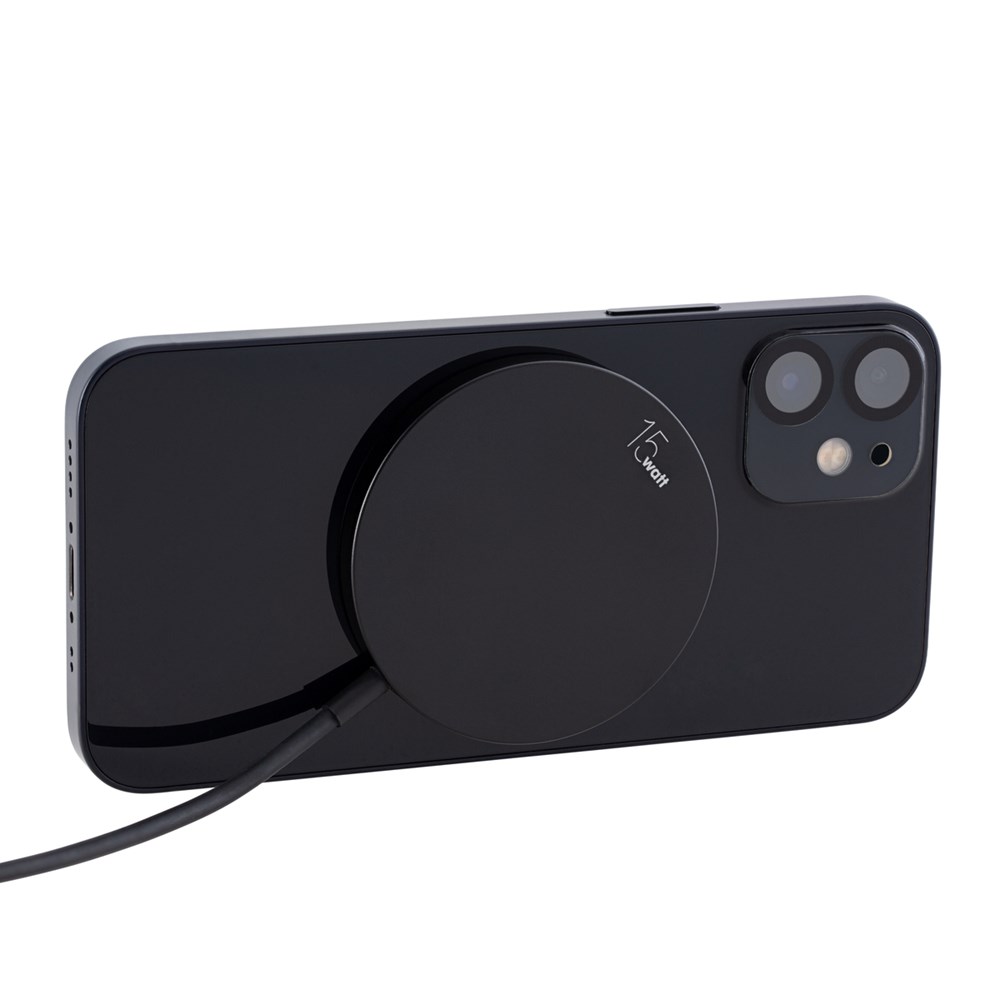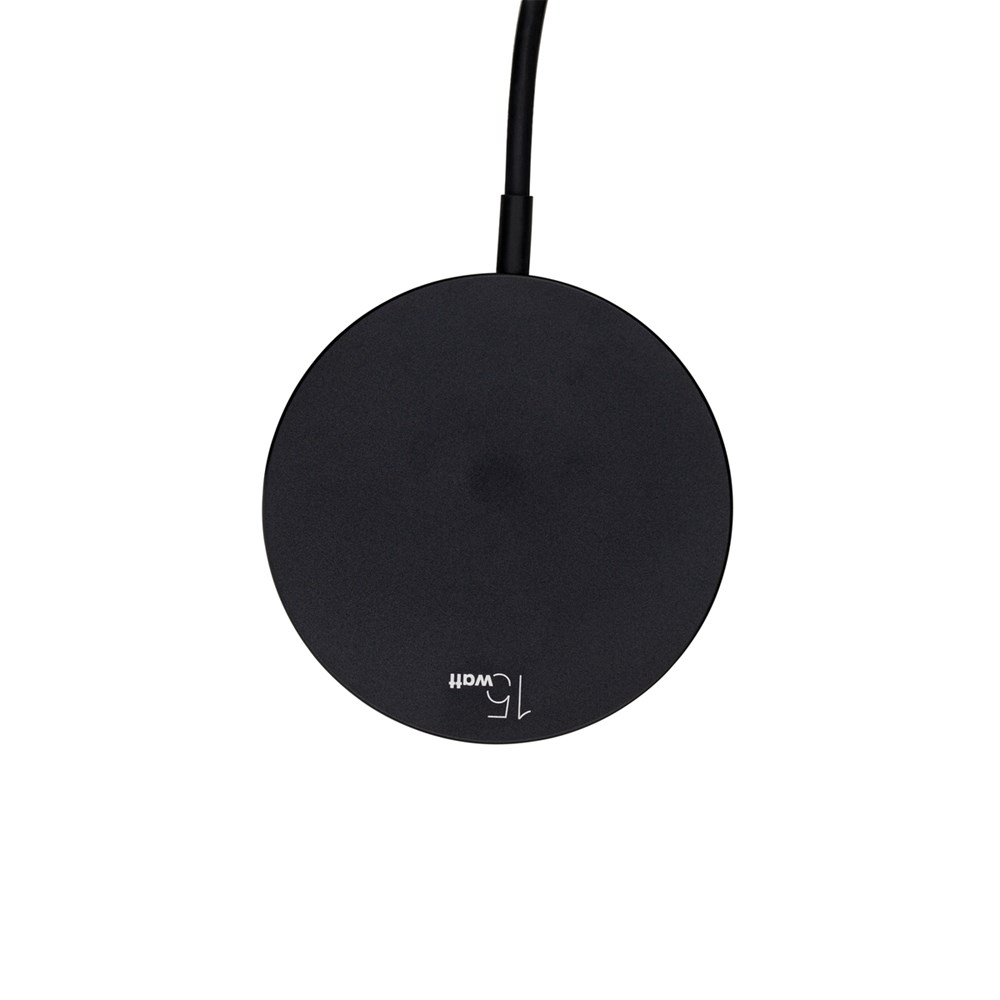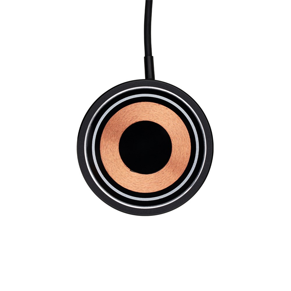 Der Wireless Charger ermöglicht schnelles und komfortables Aufladen mit einer Ausgangsleistung von bis zu 15 Watt. Das schwarze, glänzende Gehäuse aus Aluminium und die sichtbare Ladespirale aus Kupfer auf der Vorderseite sorgen für einen coolen Industrial-Look. Der magnetische Ring rund um die Ladefläche ermöglicht bei kompatiblen Endgeräten einen sicheren Halt.