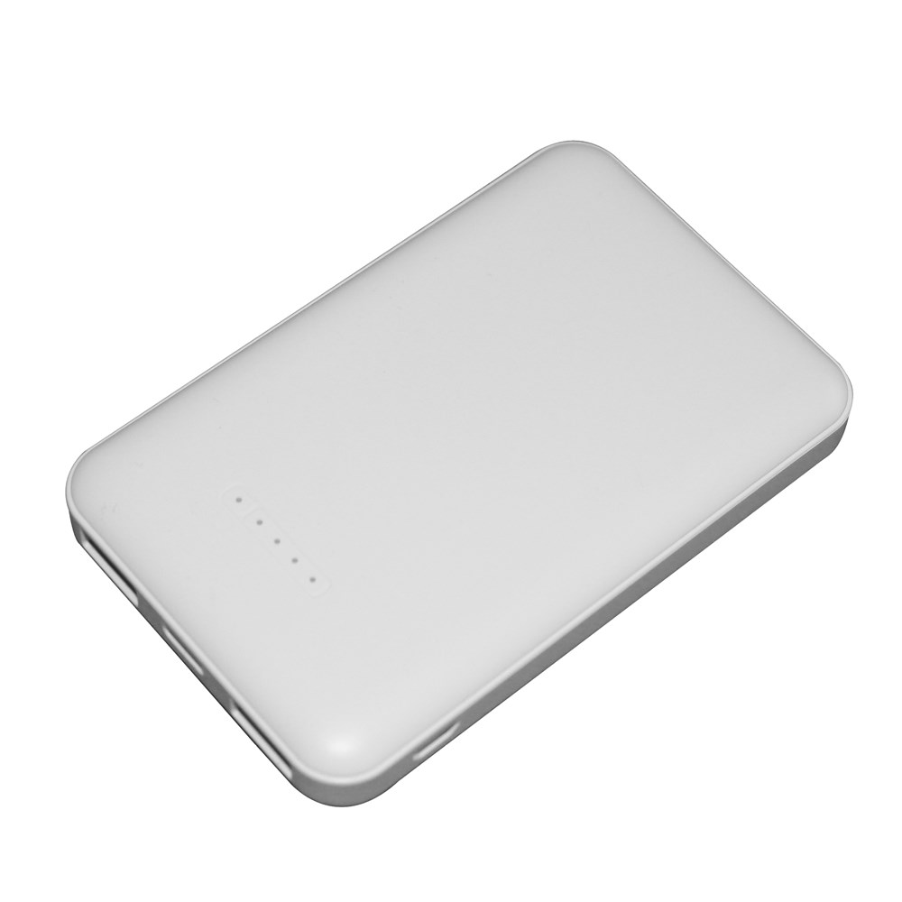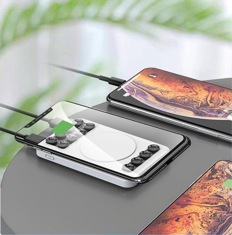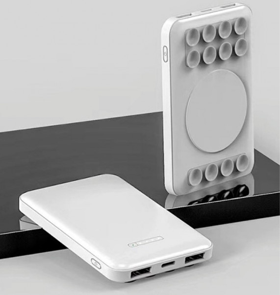 Mobiles Ladegerät mit Induktionscharger und Saugnäpfen zum Fixieren.Format: 63 x 99 x 15 mm. Funktionen: Wiederaufladbarer Lithium-Polymer-Akku mit integriertem Wireless Charger, Laden mobiler Geräte mit oder ohne Kabel möglich, mit praktischen Saugnäpfen zum Befestigen, doppelter Ladeport. Farben: schwarz, weiß. Leistung: 5 W. Kapazität: 5000 mAh, Output: 5 V - 2 A, 9 V-2 A, Input: 5 V - 2.1 A, Eingänge: 2 x USB, Micro-USB, USB-C. Inklusive: Micro-USB Kabel und 1c Druck an einer Position. Verpackung: weiße Faltschachtel.