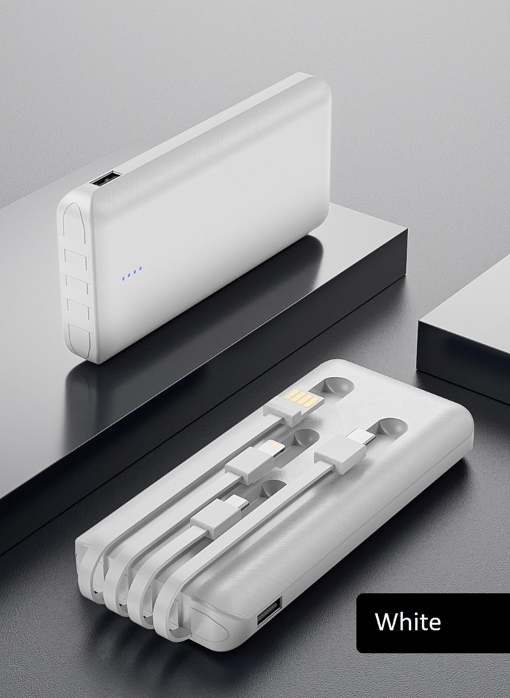 mobiles High-Speed Ladegerät für schnelles Aufladen mit integrierten Ladekabeln. Anschlüsse: Micro-USB, USB-C, Apple.Kapazität: 10.000 mAh. Format: ca. 140 x 68 x 20 mm. Farben: schwarz, weiß. Veredelung: 1c Druck an einer Position inklusive. Verpackung: weiße Faltschachtel.
