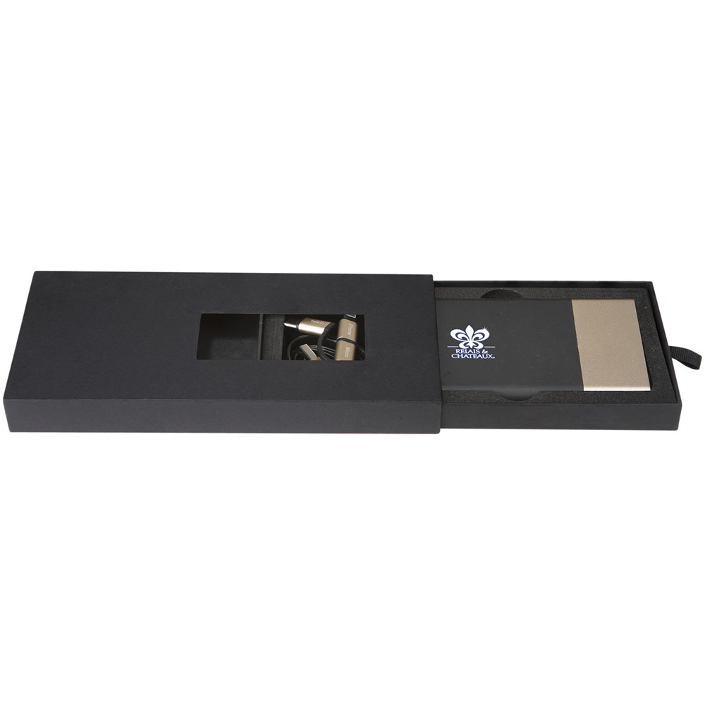 5000 mAH Powerbank mit leuchtendem Logo und einem 3-in-1 Schnellladekabel aus recyceltem PET (Typ-C, Android, iPhone), farblich abgestimmt auf die Powerbank. Die Powerbank leuchtet bei Berührung durch die "Schüttelfunktion" auf und das Logo kann bis zu 20 Tage lang leuchten, ohne dass der Akku aufgeladen werden muss. Kapazität: 5000 mAh. DC-Eingang: 5V/2A Mikro-USB. DC-Doppelausgang: 5V/2,1A und 5V/1A Schnellladung. Nettogewicht: 138 Gramm. Größe: 127 x 70 x 12 mm. Wird mit einer Geschenkbox aus Recyclingpapier geliefert.