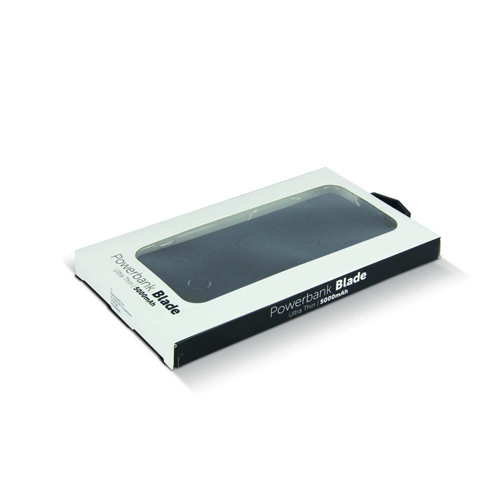 Ultra-dünne Powerbank aus der Serie Blade ( 5000mAh ) in einem stylischen und matten Design. Einzeln verpackt in einer Geschenkbox.