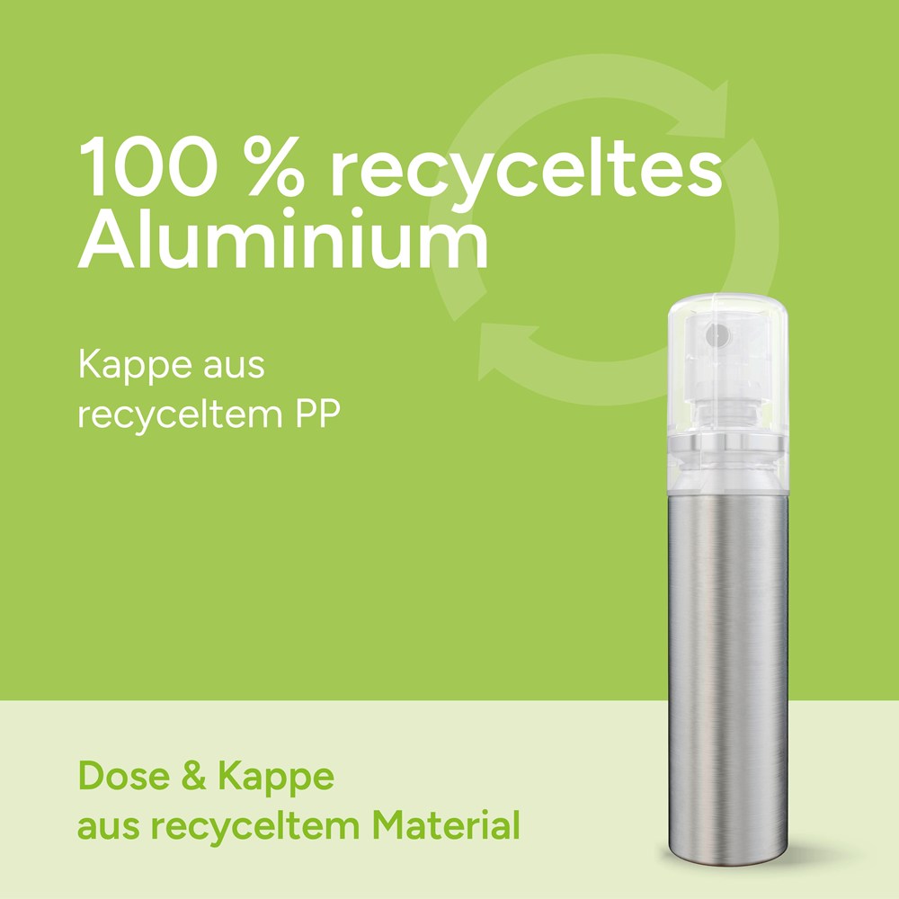 20 ml Aluminium Dose aus 100% recyceltem Aluminium, gebürstet, mit transparentem Sprühkopf und transparenter Schutzkappe. Bei der Herstellung der Sprays verwenden wir für die Dosen und Kappen ausschließlich recyceltes Aluminium und PP. Beide Materialien wurden durch die "Gelbe Tonne" in Privathaushalten gesammelt und recycelt.