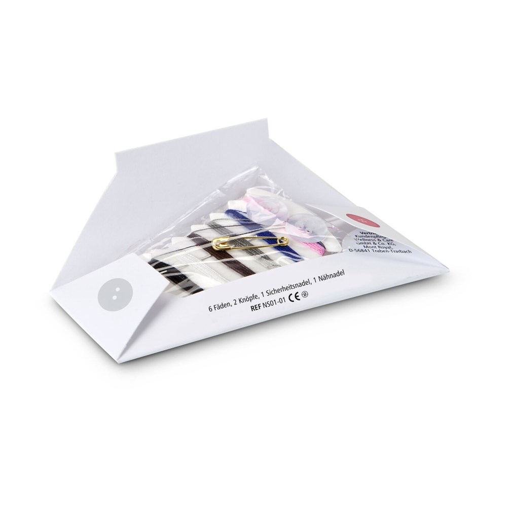 Wenn Sie unser kleines Nähset mit individuell gestaltbarem Kartonmäppchen, 6 verschieden farbigen Fäden, 2 Knöpfen, 1 Sicherheitsnadel und 1 Nähnadel stets in Ihrer Tasche haben, sollte nichts mehr schief gehen. Ein fehlender Knopf ist schnell wieder angenäht und mit der Sicherheitsnadel hat man im Handumdrehen etwas fixiert, sodass ein größeres Malheur verhindert werden kann.